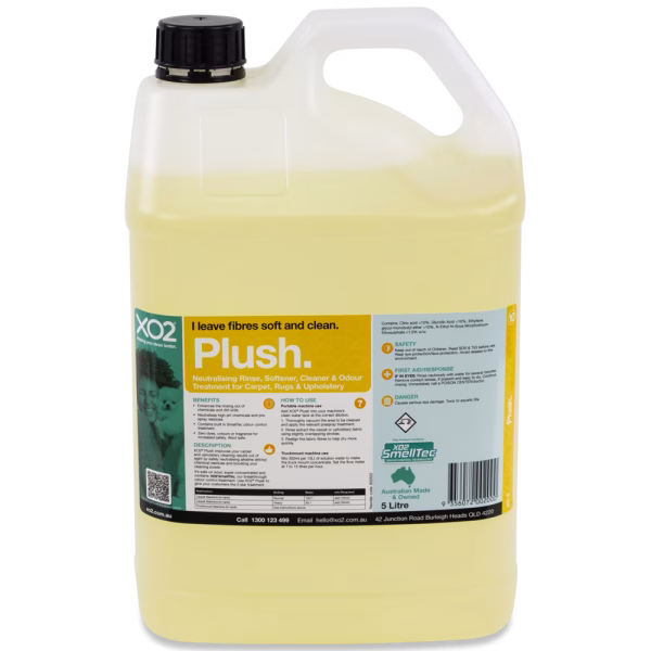 XO2 Plush is an all-in-one treatment for carpets, rugs, and upholstery, combining cleaning, softening, odour neutralising, and fabric care in